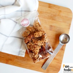 Ingredientes: Avena ecológica certificada sin gluten, crema de cacahuete, miel, fruta seca 10% (piña, manzana, albaricoque, mango, arándanos rojos....va cambiando)